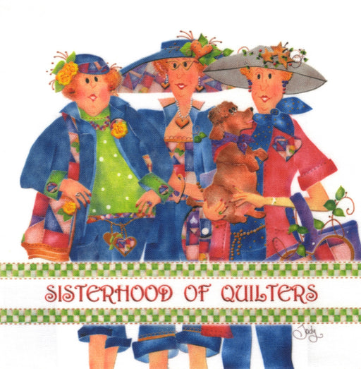 View full details6in x 6in Fabric Art Panel for Quilting Projects. Design features three women and a dog in front of a banner that says "Sisterhood of Quilters...