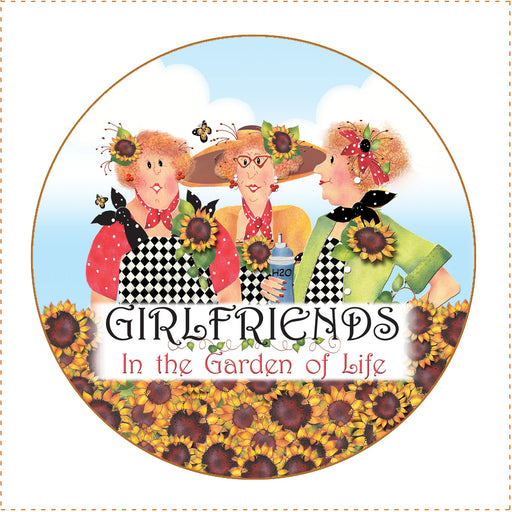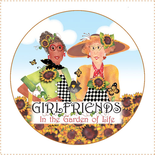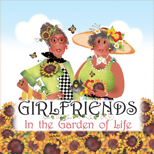 View full details6in x 6in Fabric Art Panel for Quilting Projects. Design features three women with the phase "Girlfriends in the garden of life" in front of t...