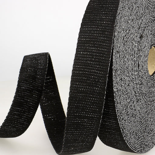 View full detailsMetalized webbing, 30mm (1-3/16") by 22 yards. 60% Lurex, 40% Polyester. Metallic silver and black with chevron design. Great for bag straps a...