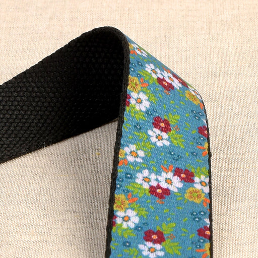 View full detailsUnique floral design webbing. 30mm (1-3/16") by 22 yards. 100% Polyester. Single side design with red, white, and green flowers, with blue fol...