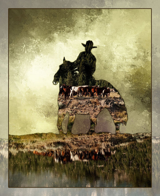 View full detailsDiscover the captivating allure of this double exposure cowboy panel, where a silhouetted rider atop a majestic horse merges seamlessly with a...