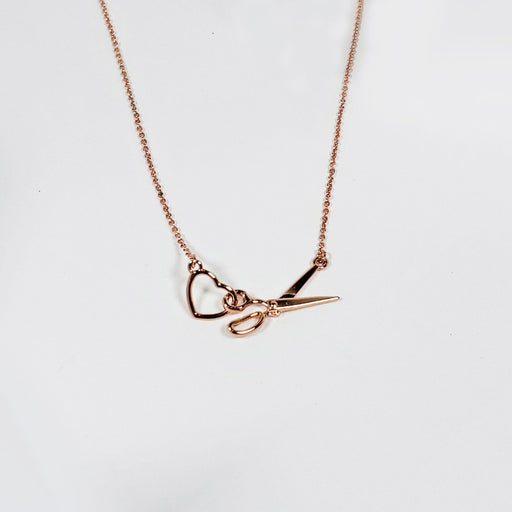 View full detailsThis adorable charm necklace features the scissors interlocking with the open heart charm. The Scissors measure approximately 1.25in width. Ne...