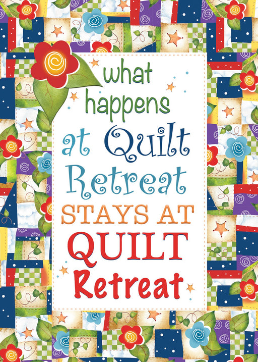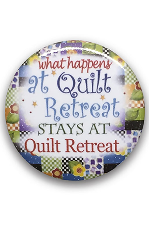 View full detailsThis package contains 12 buttons approximately 1.5in in diameter with a cute message about what happens at quilt retreat. Size: 1.5in Diameter...