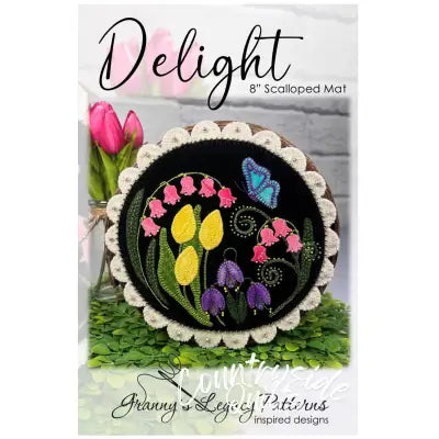 View full detailsThis mesmerizing 13" round mat reminds us of looking through a kaleidoscope! Featuring artisan dyed wool appliques, Valdani perle cotton embroidery...