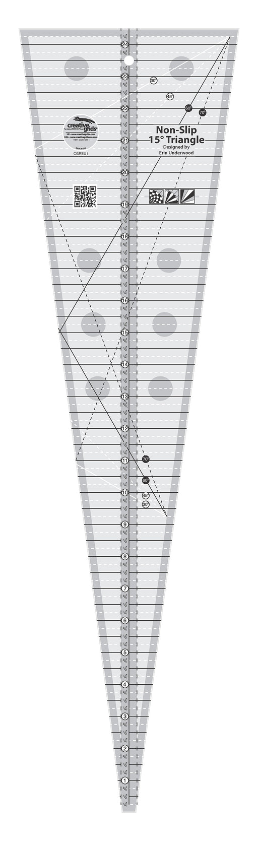View full detailsUse this 15 degree triangle ruler designed by Erin Underwood for Creative Grids® to cut wedges up to 24in. Create a complete circle with twent...