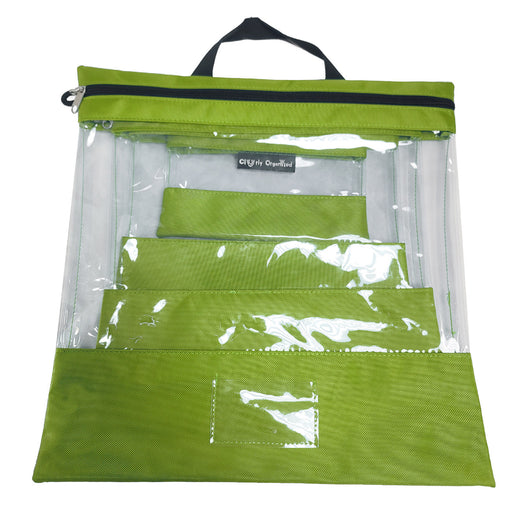 View full detailsFour clear organizing bags in the set. Dimension: 14.9"L x 15.9"H x 0.2"D 12.5"L x 11.6"H x 0.2"D 10.75"L x 9.25"H x 0.2"D 5.5"L x 8.5"H x 0.2...
