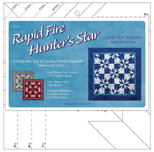 View full detailsA larger version of the Petite Hunter's Star tool, this ruler uses the same easy strip piecing steps and same accurate trim down processes, bu...