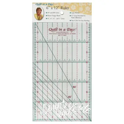 View full detailsPerfect size ruler for squaring-up pieced squares, as well as cutting pieces smaller than 6in. Ruler has 1 inch, 1/2 inch, 1/4 inch, and 1/8 inch c...