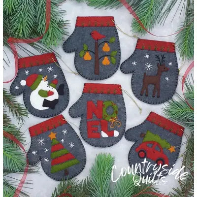 View full detailsCharcoal gray mittens sporting perky red cuffs are adorned with a partridge in a pear tree, snowman catching snowflakes, geometric tree, NOEL, car ...