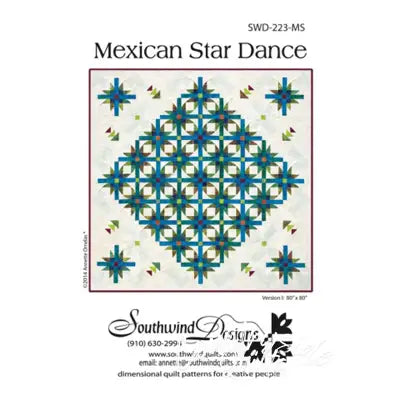 Mexican Star Dance is a dimensional curved piecing pattern in two settings and sizes. 80in x 80in and 65in x 80in. It is a larger expanded versio...