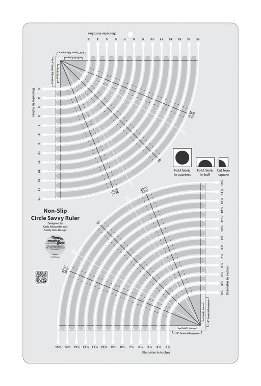 Creative Grids Circle Savvy 11-3/4in x 18-1/2in Quilt Ruler  This ruler is designed to cut circles, semi-circles, and quarter-circles from 3in...