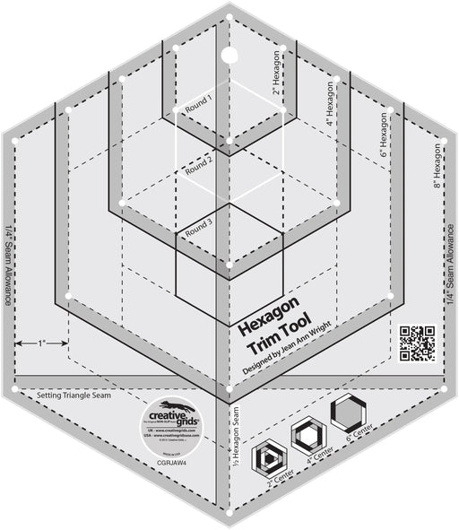 Creative Grids Hexagon Trim Tool Quilt Ruler Create perfect pieced hexagons with 2in, 4in, or 6in finished centers with this Trim Tool. Or, use...