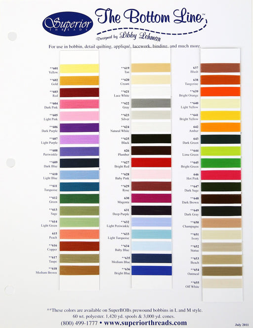 This color card shows the Bottom Line thread. Made with actual thread. Color Cards are intended for store use not for resale. Made of: Paper a...