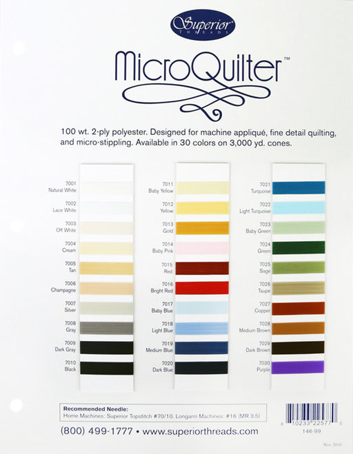 View full detailsThe MicroQuilter thread color card is wound with actual thread to be used as a reference. Includes all 30 colors. Color Cards are intended for...