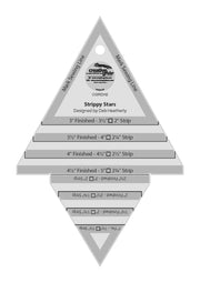 The Strippy Stars Tool designed by Deb Heatherly for Creative Grids® makes perfect floating star point units from squares and strips in eight different sizes. · Made in the USA with high quality acrylic and precision measurements ensuring accuracy for your quilting, sewing, patchwork, and crafting projects. · Creative Grids® exclusive non-slip grip allows you to easily slide the ruler over the fabric until positioned correctly. Then, when slight pressure is applied, the grip holds the ruler in place, eliminating slipping while you cut. · Easy to read markings. · Finished sizes, squares, and strips required are printed right on the tool. · Makes star point units ranging from 1-1/2in to 4-1/2in. · Four star points, a center square, and 4 corner squares make up a block. When put together, blocks range from 3in to 13-1/2in finished size. · Star points are designed to float, so you don’t have to worry about cutting off your points when you put the blocks together. · Comes with fully illustrated step by step instructions. · Scan the QR Code printed on the insert to view a how-to video of these features and to see the projects that can be made with this tool. Total Size: 5in x 7-1/2in Creative Grids® Rulers are made in the USA and sold through independent quilt shops as well as select online retailers. Creative Grids® products have a MAP/IMAP (Minimum Advertised Price/Internet Minimum Advertised Price) Policy. Please do not advertise them for less than the suggested retail price.