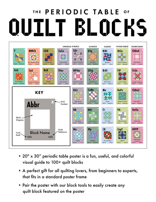 Afficher tous les détailsThis full-size 24” x 36” periodic table poster is a fun, useful, and colorful visual guide to over 100 quilt blocks organized into XX categori...