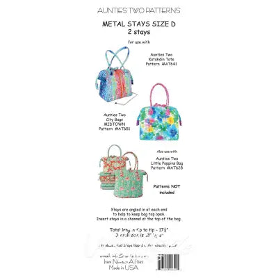 Afficher tous les détailswo metal stays. Pre-bent, stainless steel and rubber tipped. For use with AT628 Little Poppins Bag, AT641 Katahdin Tote and AT651 City Bags Midtown...